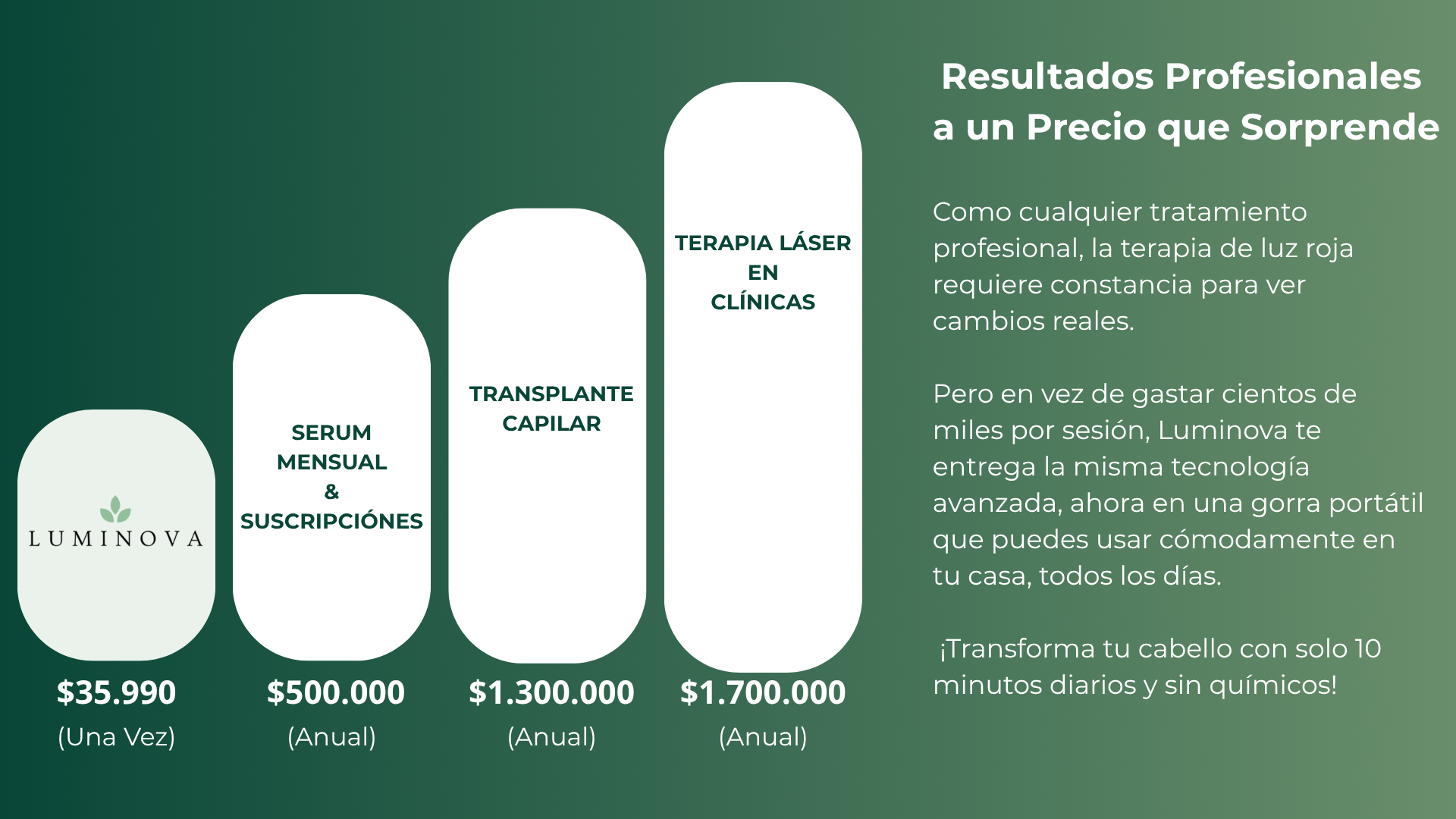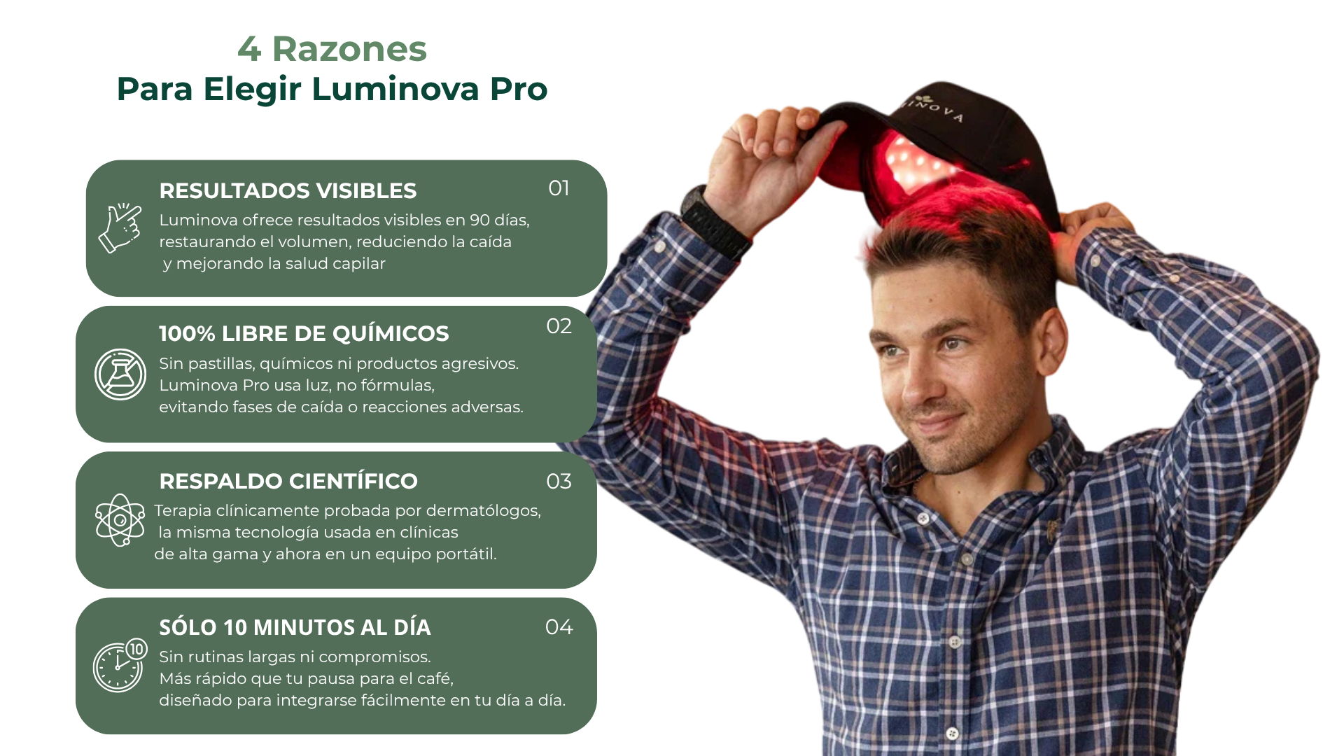 "Llevo usando Luminova Pro todos los días por 10 minutos, y en la semana 5 ya empecé a notar menos caída. Es cómodo, no molesta y de verdad se nota la diferencia"
