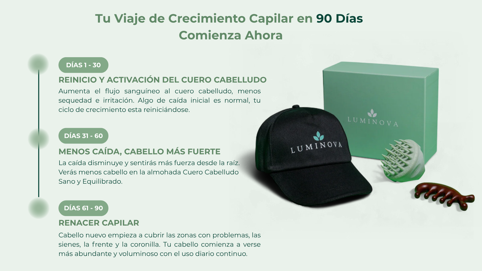 Luminova Pro™ está diseñado para apoyar el crecimiento del cabello en diferentes etapas de la pérdida capilar. Muchos clientes han visto mejoras significativas con uso constante. Ofrecemos una garantía de satisfacción de 90 días para que puedas probarlo sin riesgos.